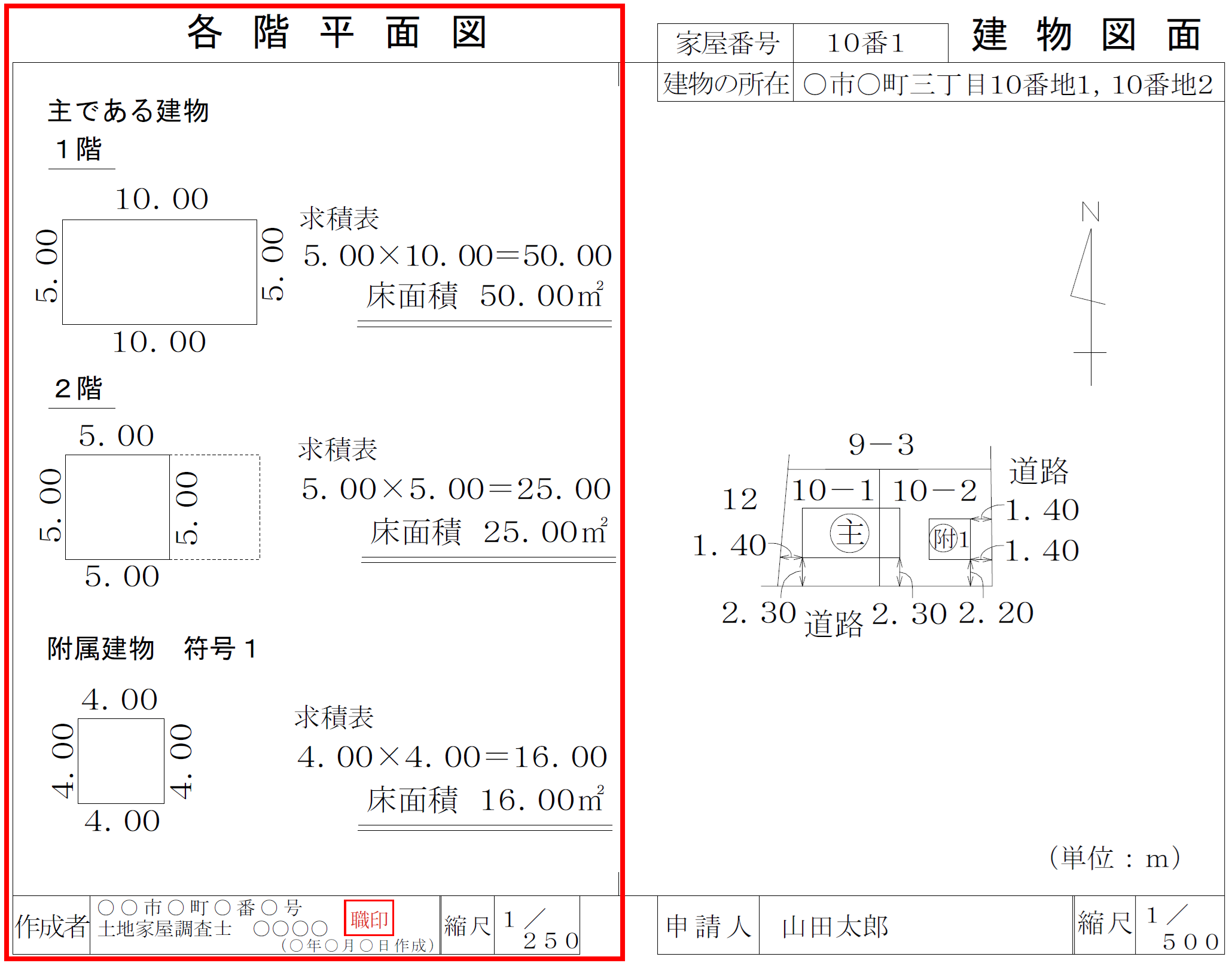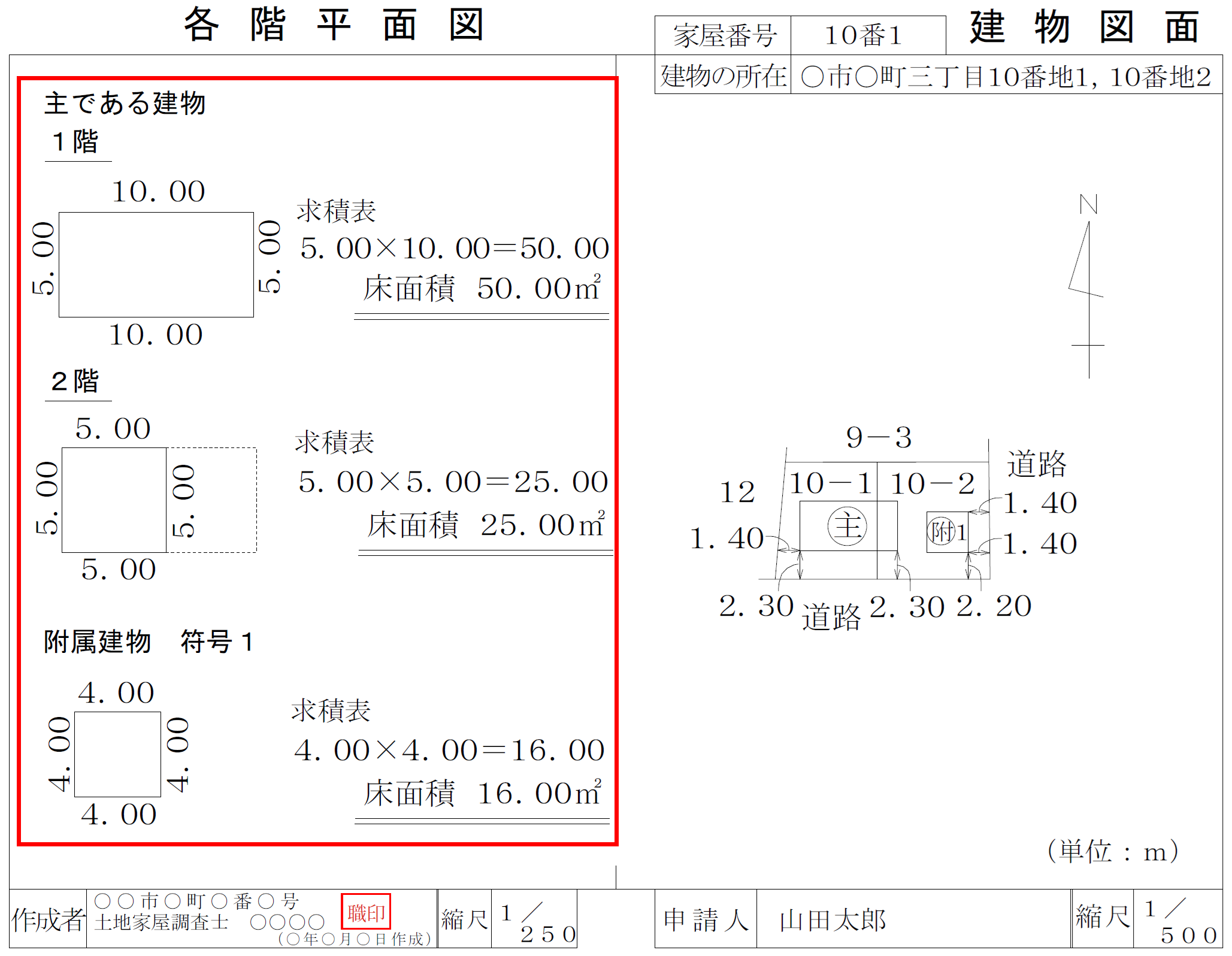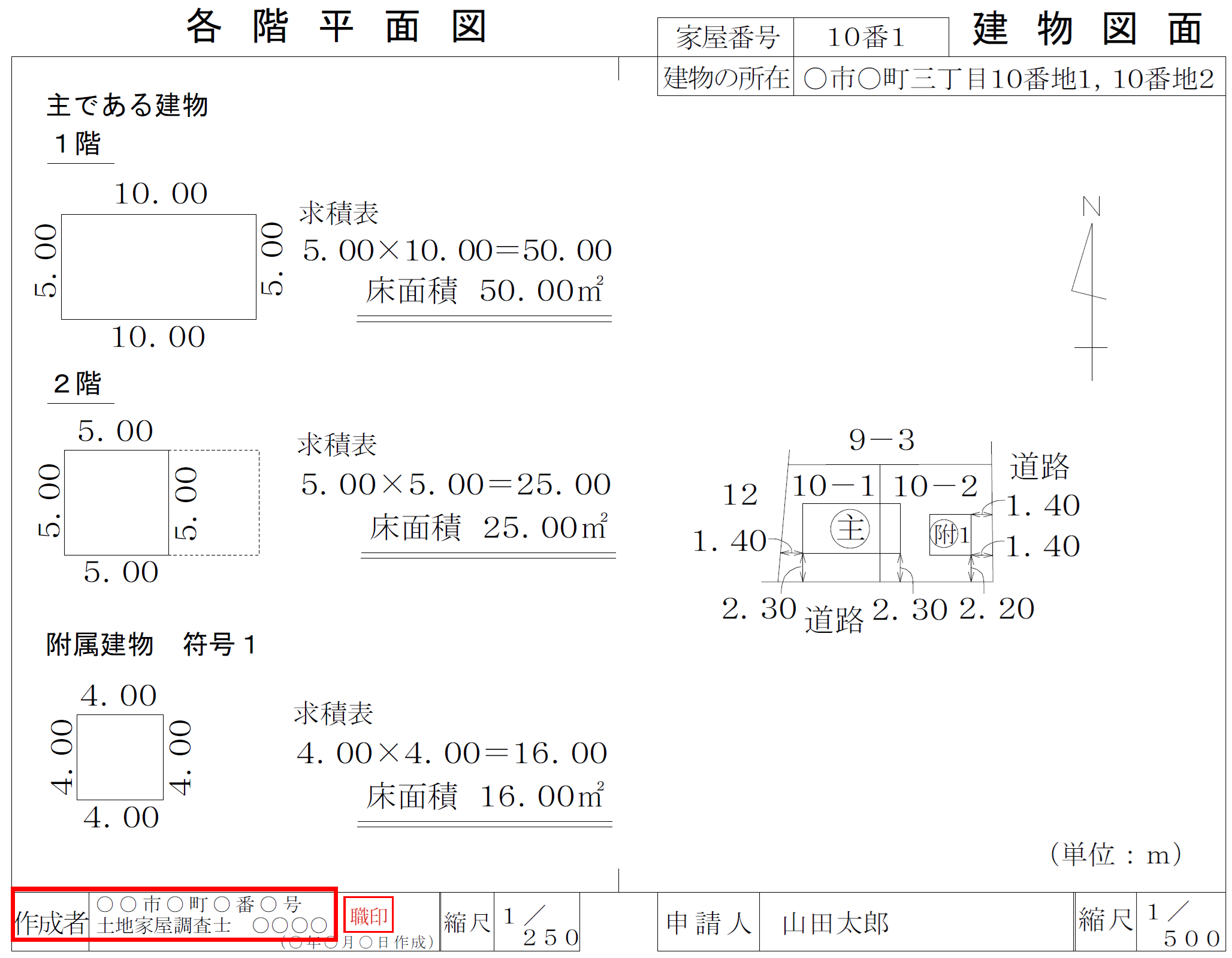 各階平面図と建物図面の作成者の住所と氏名が記載されています。