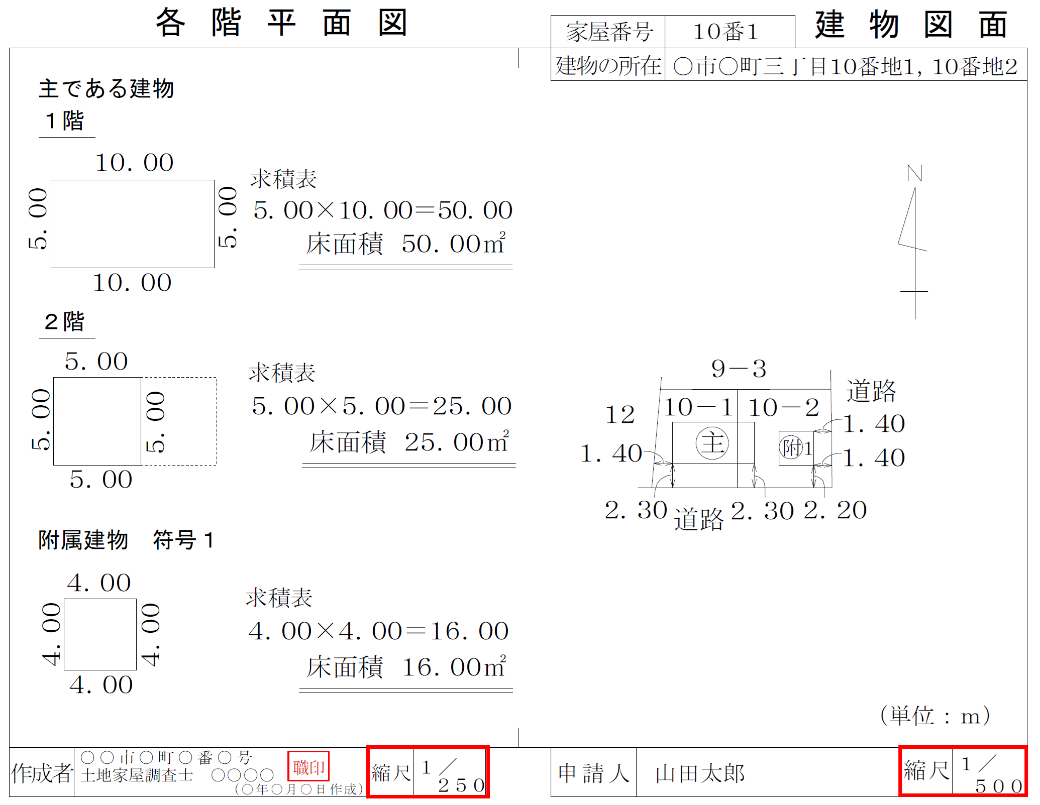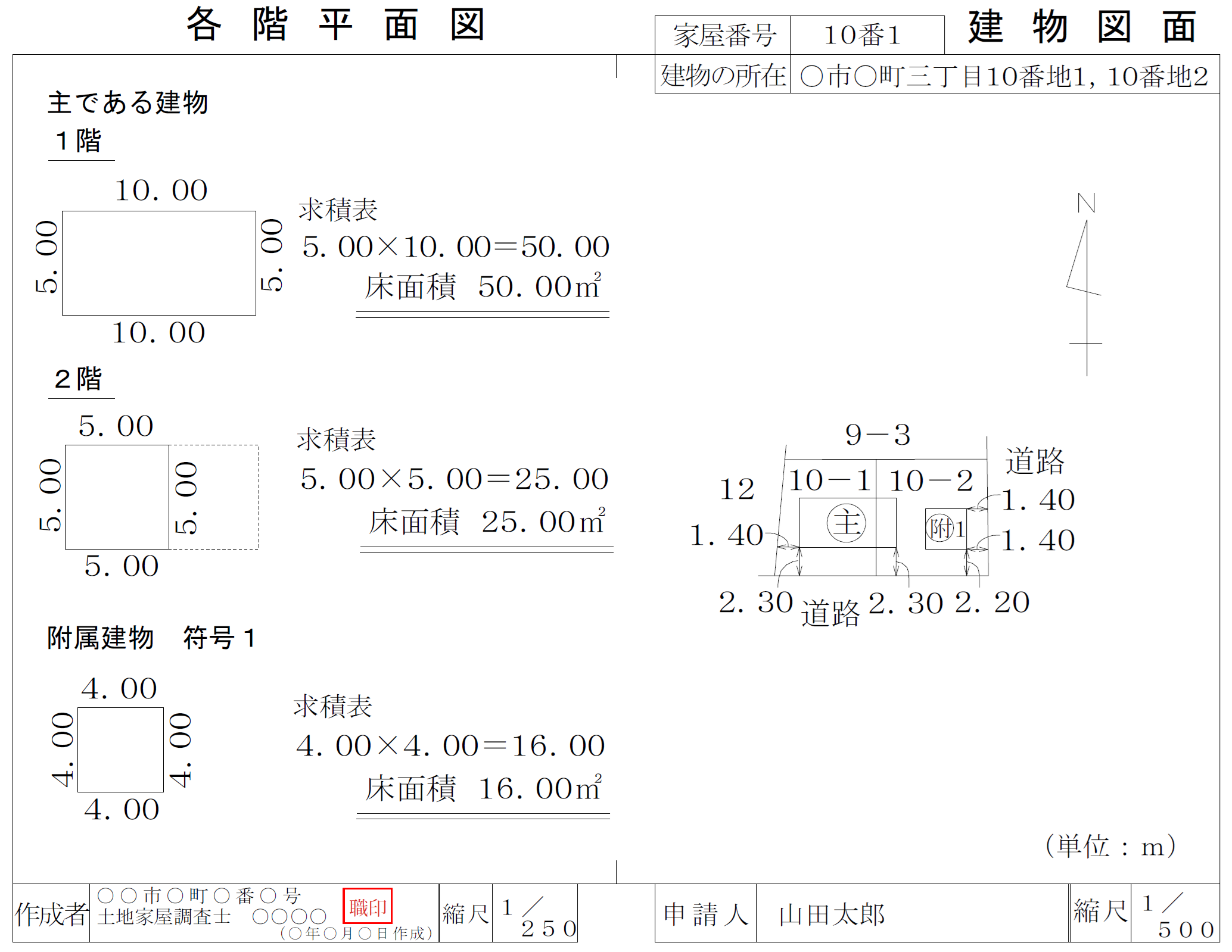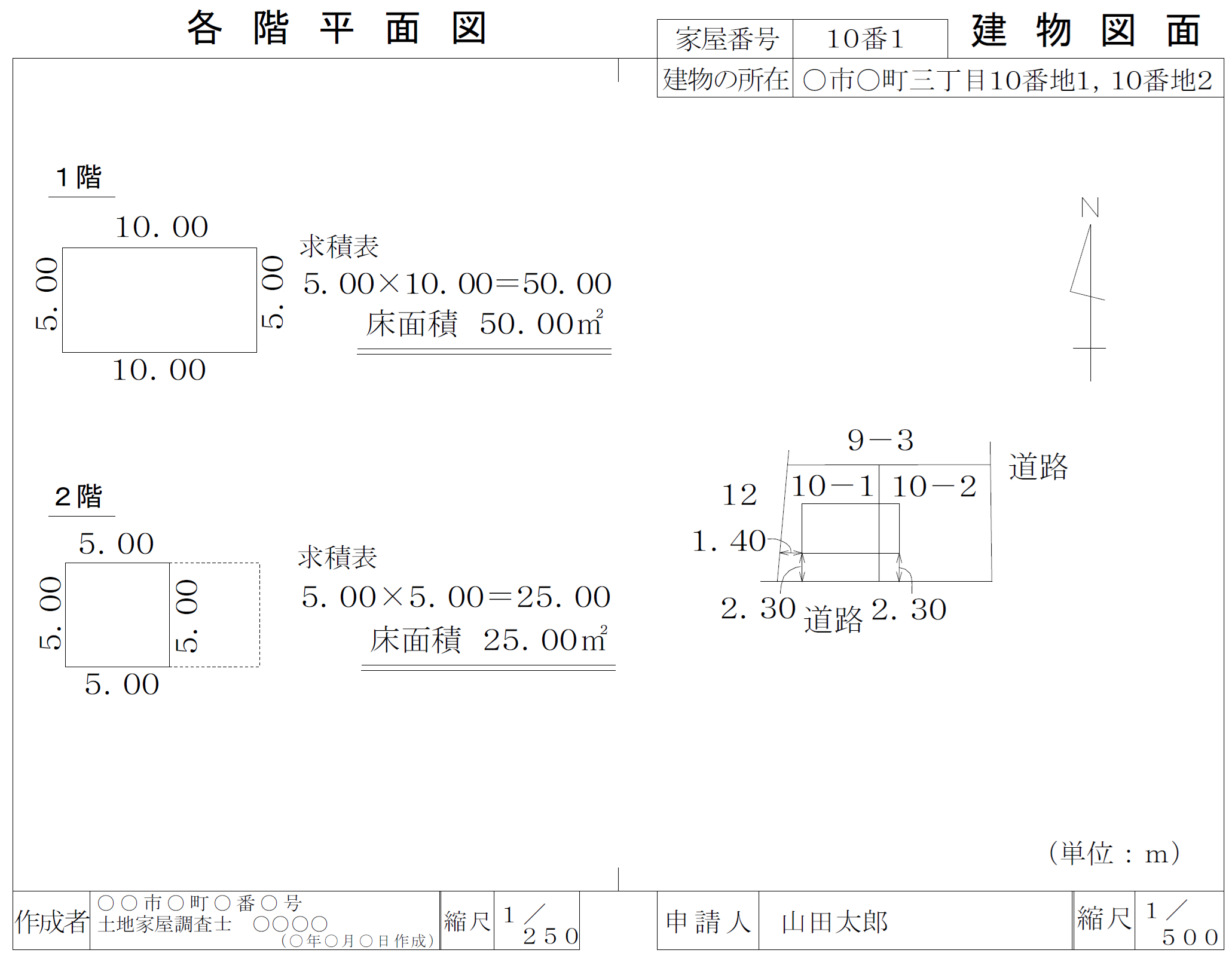 各階平面図と建物図面の作成者の住所と氏名が記載されています。