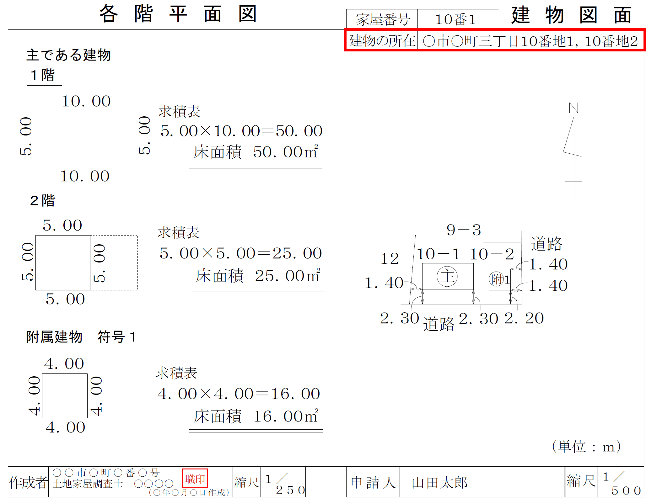 なお、建物の所在地番は、建物の床面積が多い土地の地番、